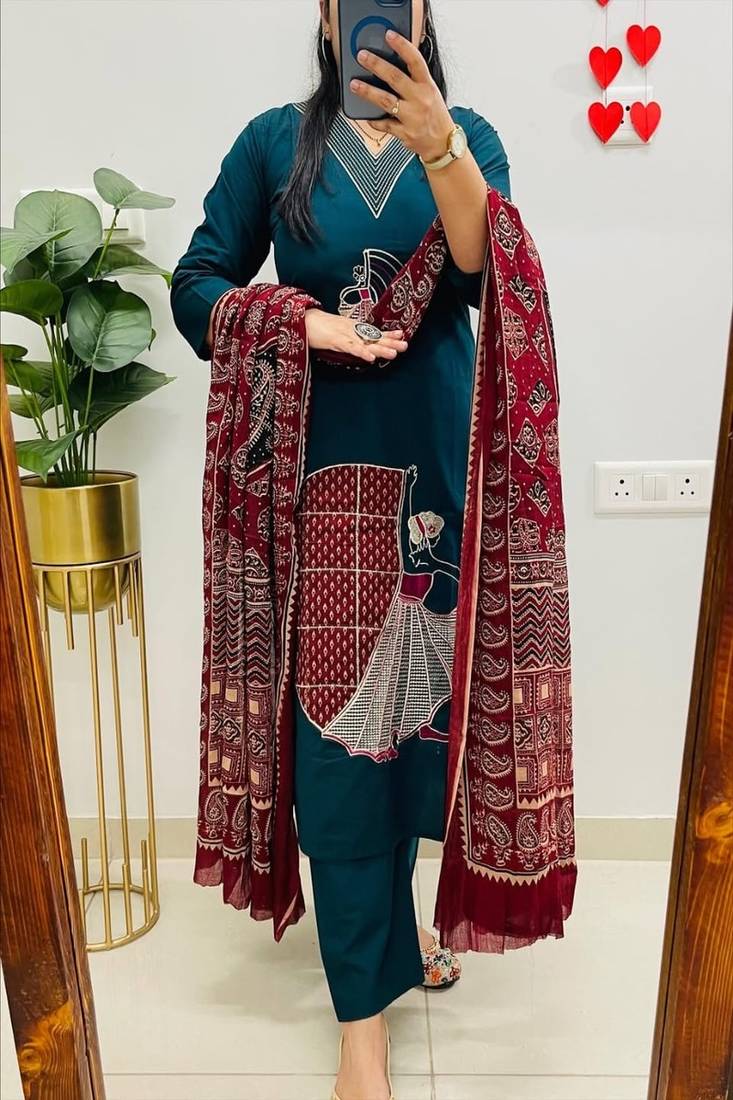 Elevate your everyday ethnic style with this elegant Floral Embroidered V-Neck Pure Cotton Kurta Trouser & Dupatta Set. Crafted from breathable pure cotton fabric, this beautifully designed kurta set offers all-day comfort while keeping your look effortlessly graceful. The kurta features delicate floral embroidery around the neckline, adding a touch of femininity and charm. Paired with a matching cotton trouser and a soft, coordinated dupatta, this set is perfect for festive occasions, casual outings, office wear, and summer gatherings. Style it with minimal jewelry and flats or heels for a refined ethnic look.