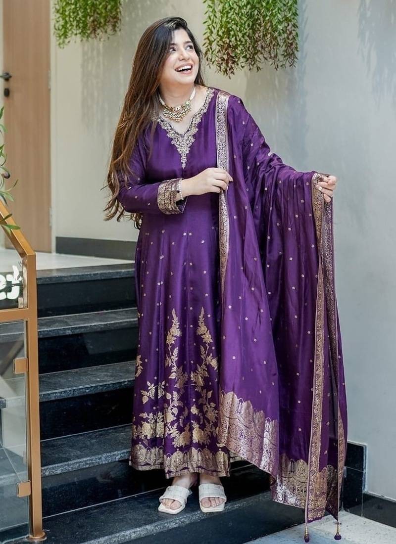 Floral Embroidered V Neck Silk Kurta Trosuer & Dupatta Set