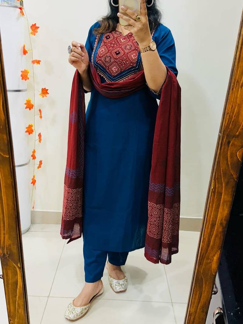 If you find the product for less we'll match it! Know MoreMake a classy statement with this Blue Pure Cotton Printed Kurta Set featuring a striking contrast maroon printed dupatta. The beautifully designed printed neckline adds charm, while the breathable cotton fabric keeps you cool and comfortable throughout the day. Ideal for office, festive gatherings, or everyday elegance.