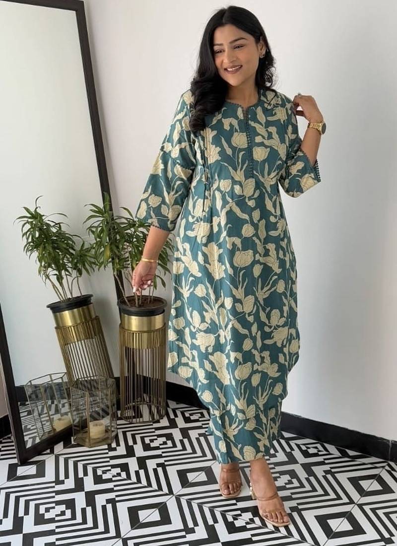 Floral Printed Blue Round Neck Pure Cotton Kurta Set With Trouser