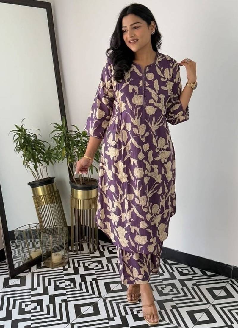 Floral Printed Purple Round Neck Pure Cotton Kurta Set With Trouser