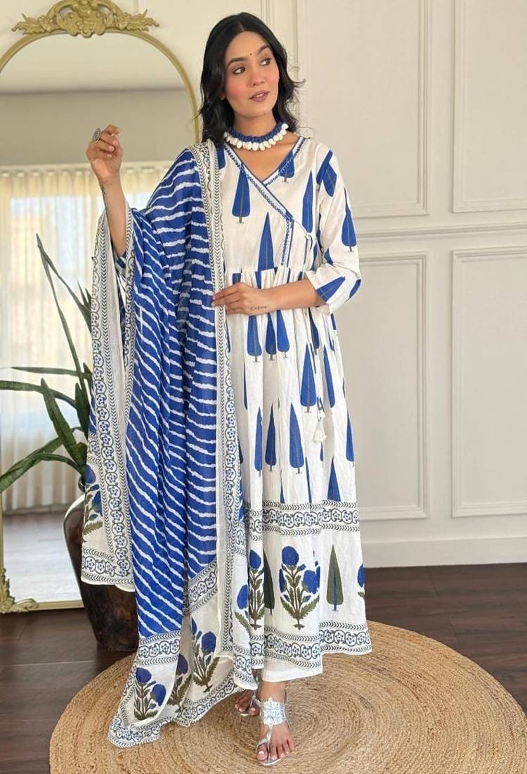 Floral Printed V Neck Pure Cotton Kurta Trosuer & Dupatta Set