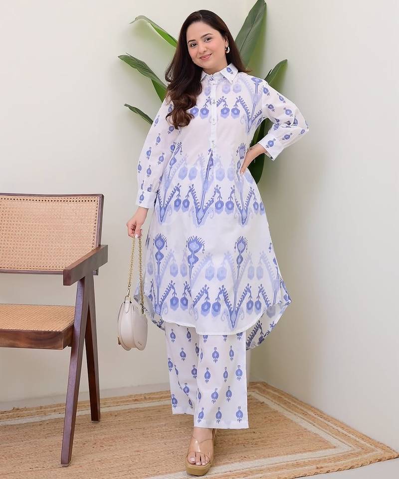 Paired with matching printed trousers, this kurta set is perfect for office wear, casual outings, and warm-weather days.