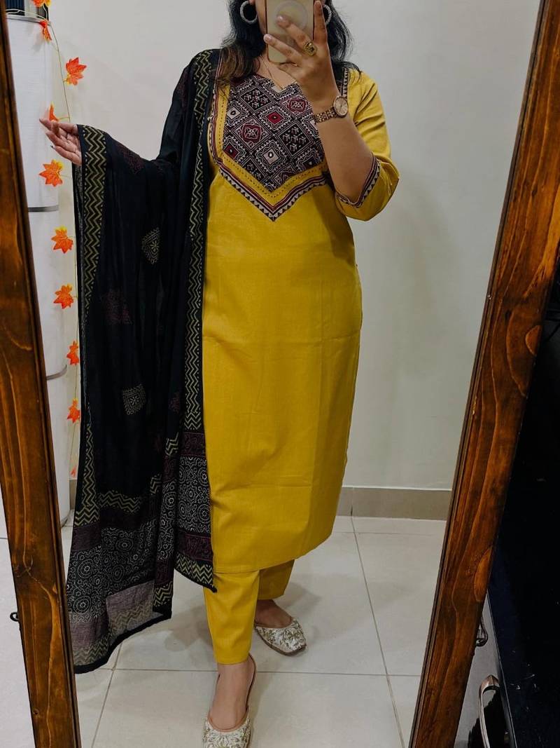 If you find the product for less we'll match it! Know MoreRefresh your ethnic wardrobe with this Yellow Pure Cotton Printed Kurta Set designed for all-day comfort and style. Crafted from 100% pure cotton, this set features a beautifully printed yoke, matching trousers, and a contrast black printed dupatta that enhances the look effortlessly. The soft breathable fabric makes it ideal for daily wear, office wear, festive occasions, or casual outings.