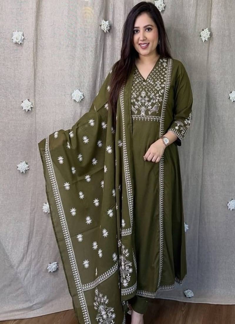 Green Embroidered V Neck Pure Cotton Kurta Trouser Dupatta Set