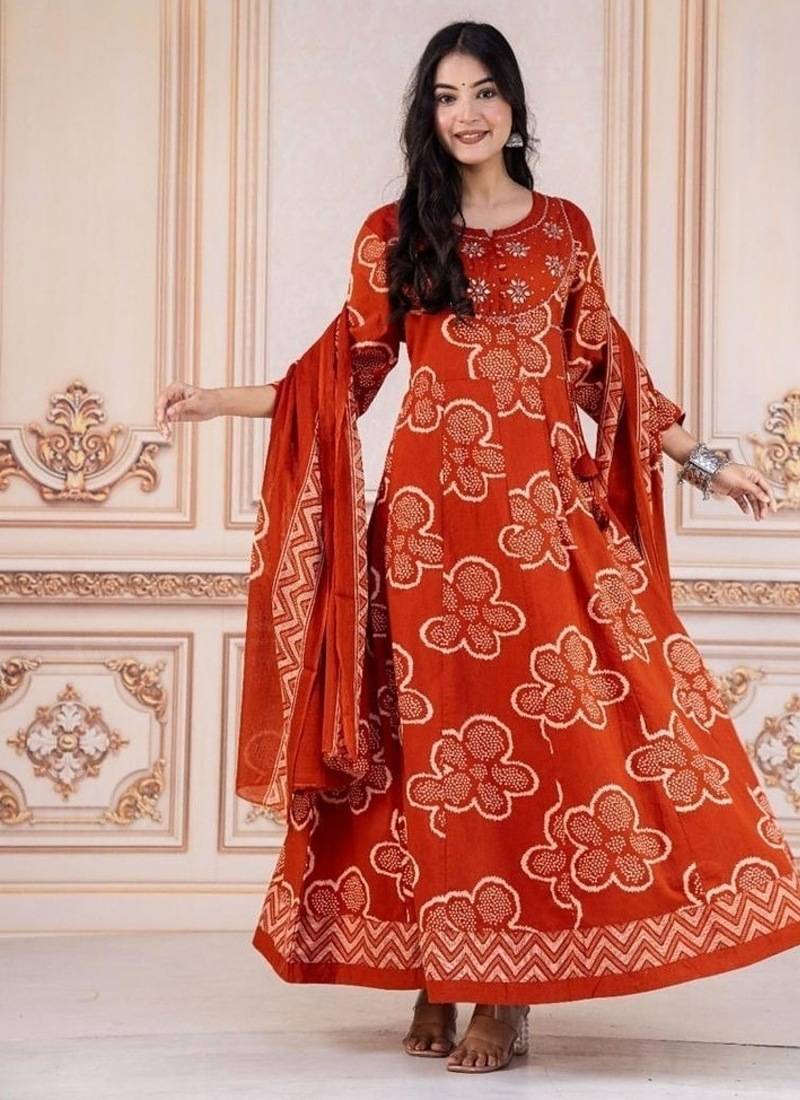 Orange Embroidered Round Neck Pure Cotton Kurta Trouser Dupatta Set