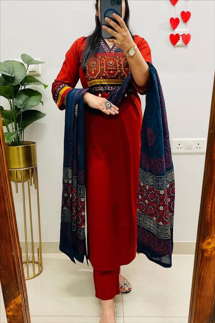 Red Embroidered V Neck Pure Cotton Kurta Trouser Dupatta Set