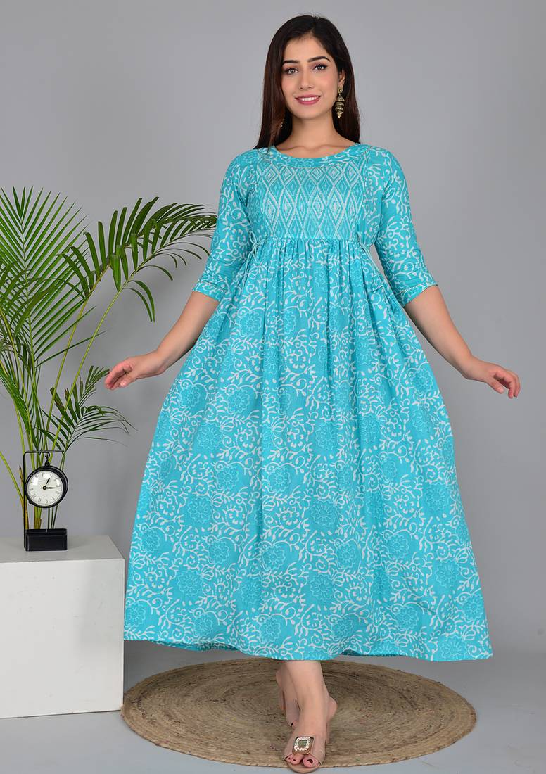 • Product Id : 4678728 • Package Details : 1 Maternity • Type : Ethnic Kurtis • Region : India • Occasion : Casual • Fabric : Cotton • Work : Printed • Type : Hand Embroidery • Look : Fashion • Sleeve : Quarter Sleeve • Neck Style : Round Neck • Color : Blue • Stitching : Stitched • Length : 46.0 Payments [+]