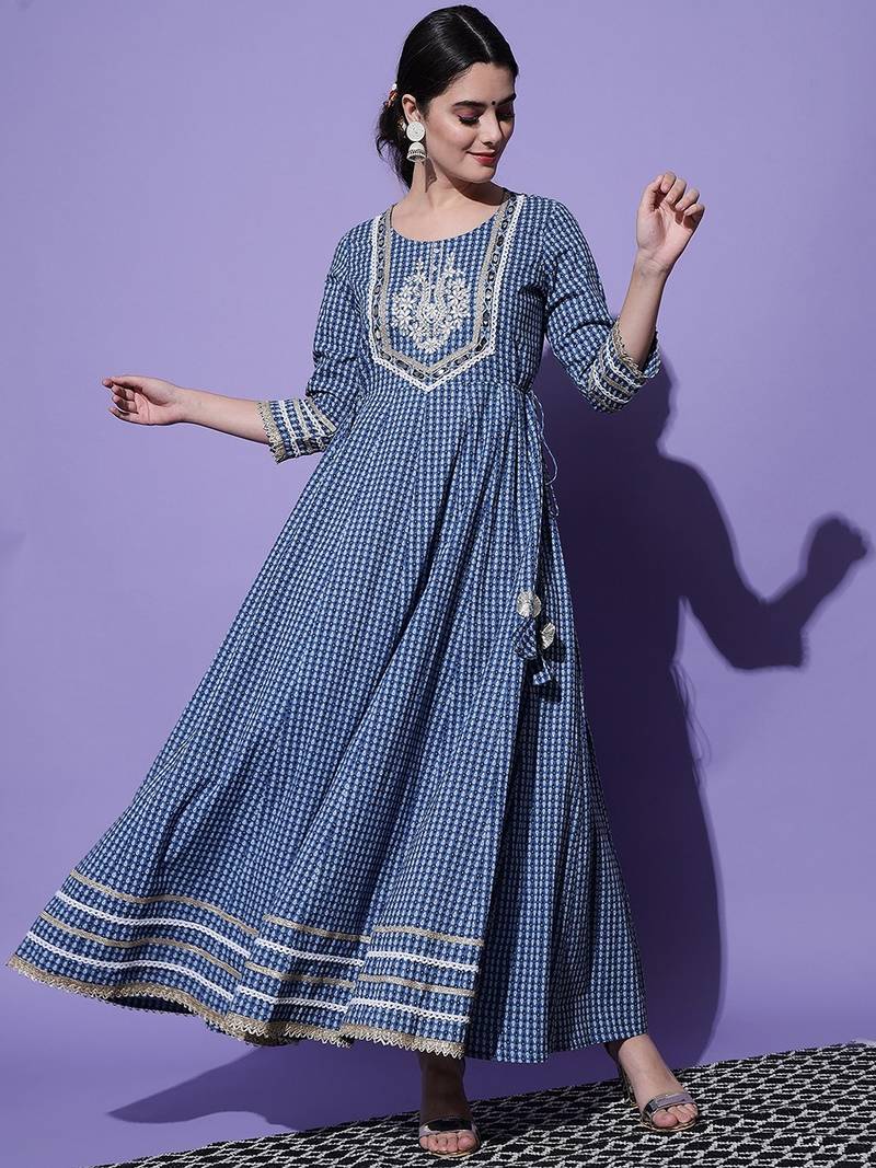 Blue Ethnic Motif Printed With Embroidery Work Cotton Anarkali Kurta