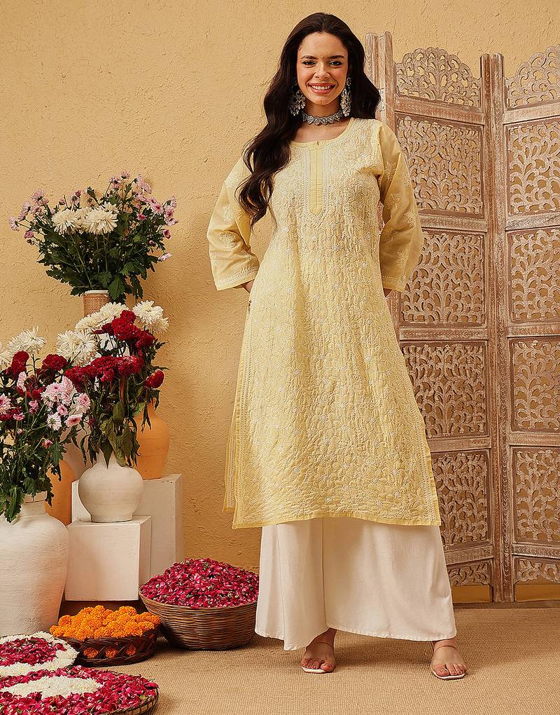 Ada Hand Embroidered Fawn Cotton Lucknowi Chikankari Straight Kurta