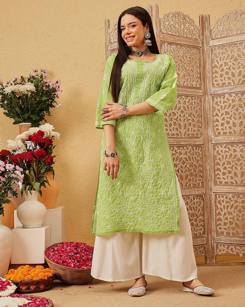 Ada Hand Embroidered Green Cotton Lucknowi Chikankari Straight Kurta