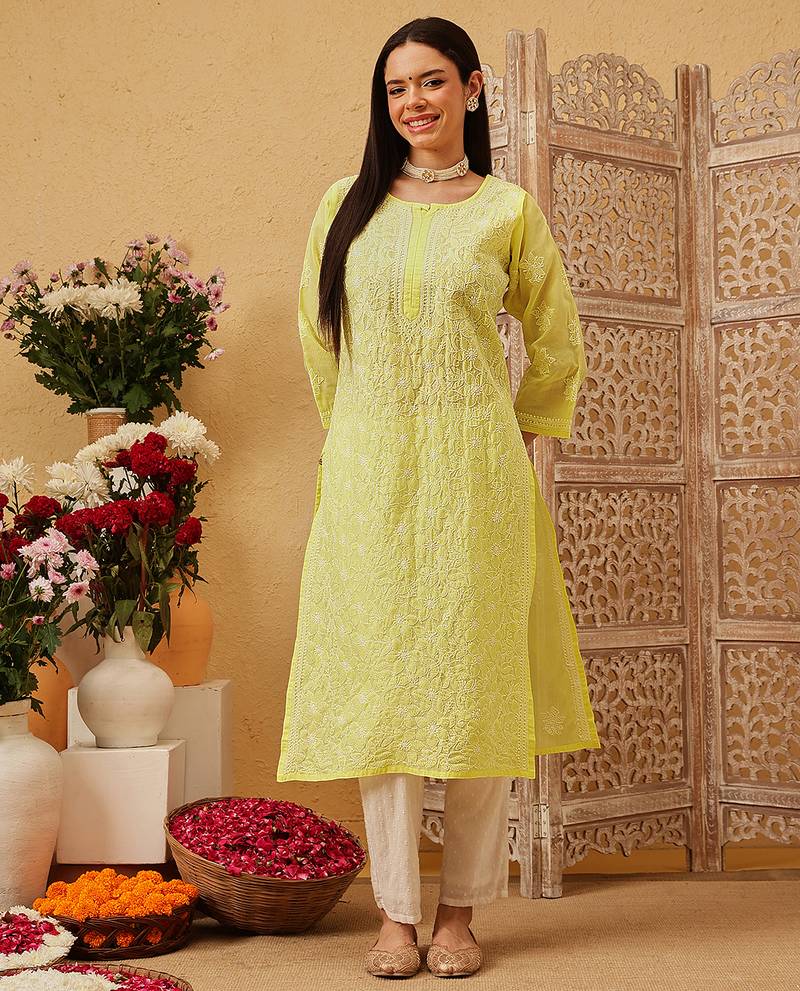 Ada Hand Embroidered Lemon Yellow Cotton Lucknowi Chikankari Straight Kurta