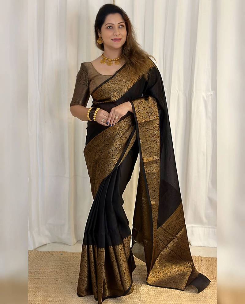 Black Soft Art Silk Banarasi Jacuard Work Designer Party Wear Saree With Unstitched Blouse Piece