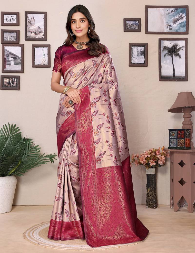 Cream Wine Soft Silk Blend Banarasi Jacuard Work Designer Party Wear Saree With Unstitched Blouse Piece