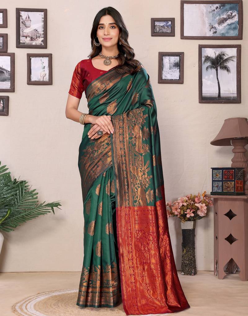 • Border : Designer Border • Color : Green • Fabric Of : Banarasi Silk • Color : Green Blouse Details