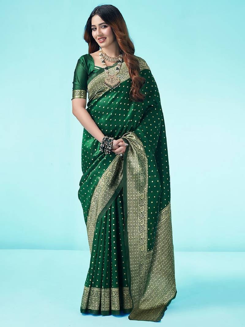 Green Soft Silk Blend Banarasi Jacuard Work Designer Party Wear Saree With Unstitched Blouse Piece