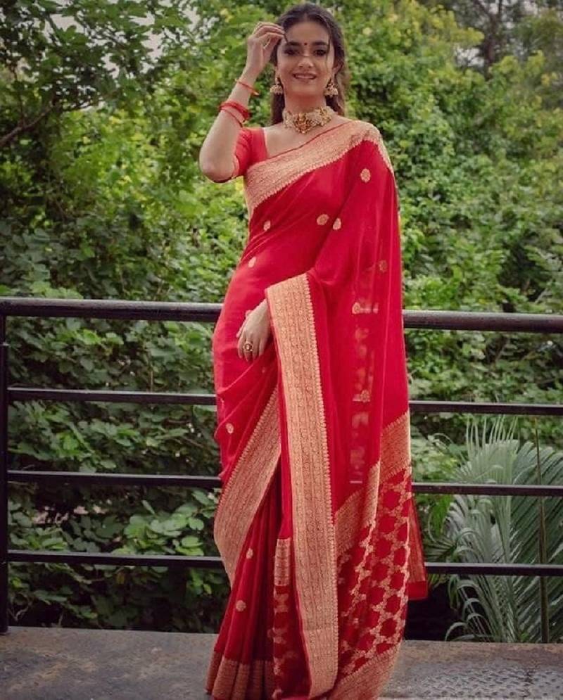 Red Soft Art Silk Banarasi Jacuard Work Designer Party Wear Saree With Unstitched Blouse Piece