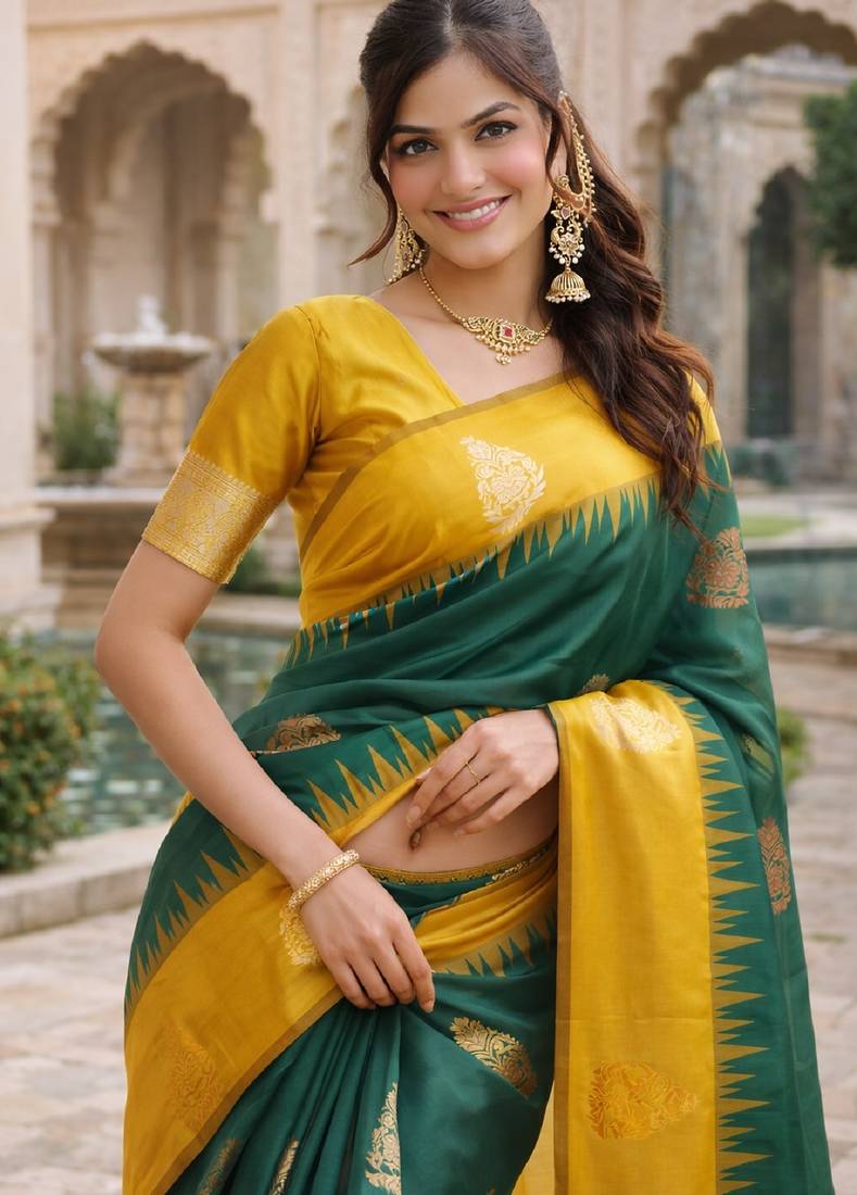 • Saree : Color- Green / Fabric- Silk Blend • Blouse : Color- Gold / Fabric- Silk Blend Saree Details