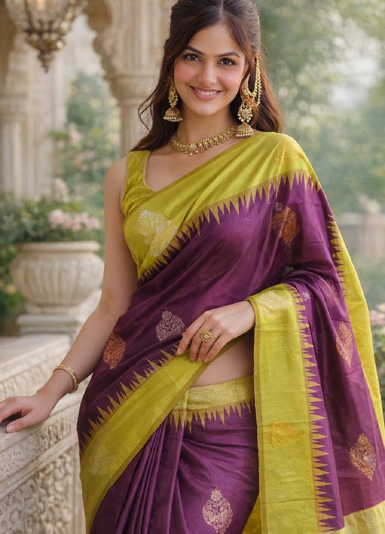 Yellow Wine Silk Blend Jacuard Work Designer Party Wear Saree With Unstitched Blouse Piece
