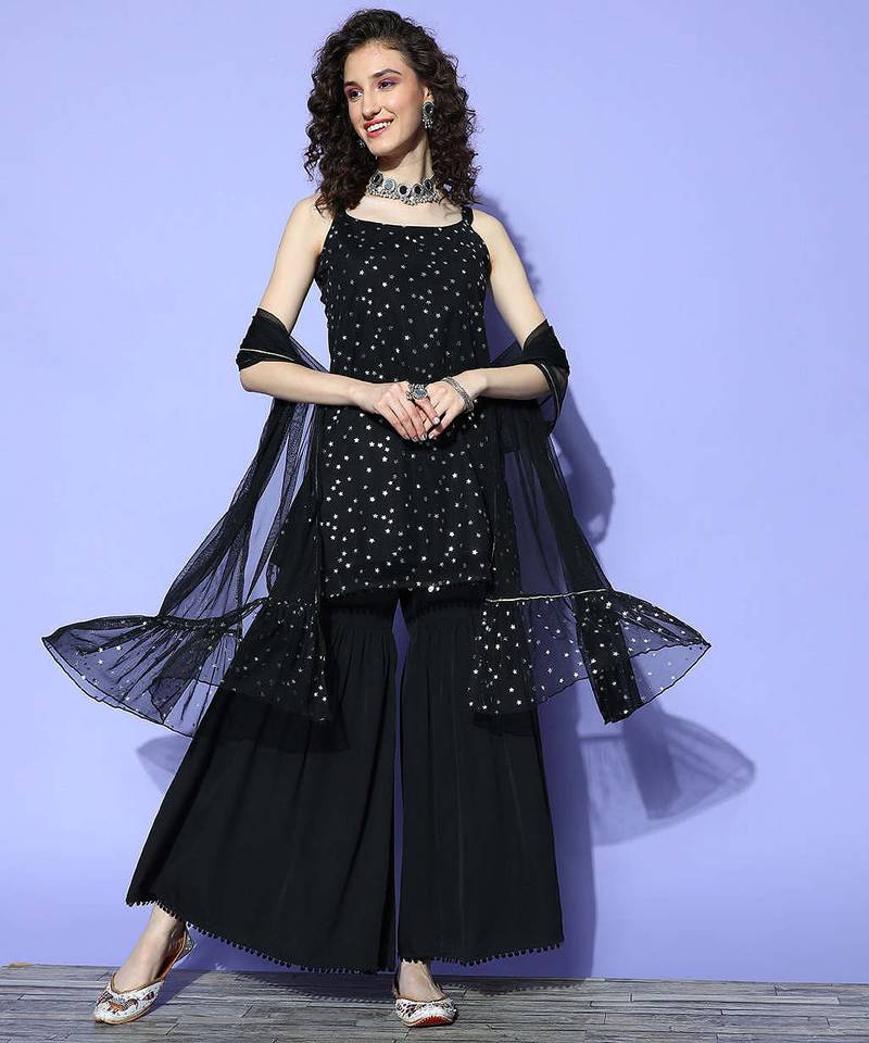 • Product Id : 4715876 • Package Details : 1 Kurta / 1 Palazzo / 1 Dupatta • Type : Kurta Sets • Occasion : Festive • Fabric : Net • Work : Plain • Sleeve : Sleeveless • Neck Style : Low Cut Neck Kameez • Color : Black • Stitching : Stitched • Length : 32.0 Payments [+]
