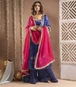 Comes with the velvet royal blue palazzo and contrasting rani glass organza dupatta with lace and machine embroidered motifs all-over.