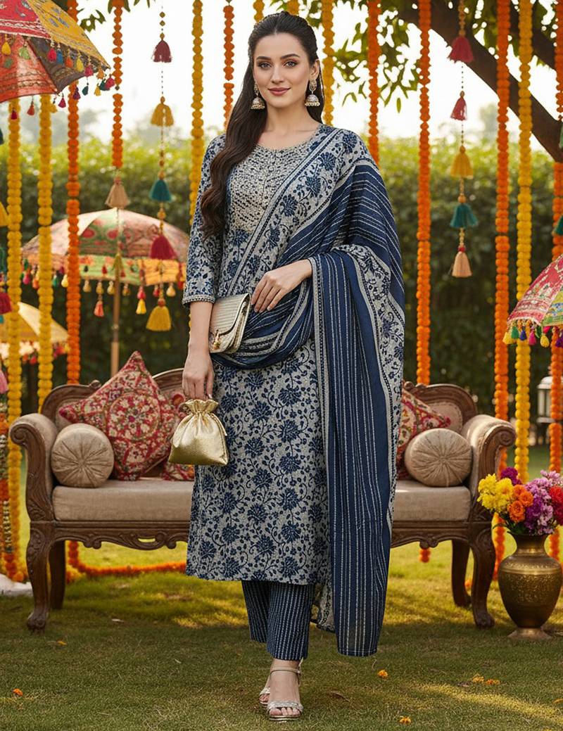 Pick this silk blend-blend dress for any casual or formal occasion. This grey-colored floral printed kurta has a round embroidered neckline adorned with frontal buttons. It has three-quarter sleeves, a straight hemline, and comfy side slits. It is paired with vertically striped straight trousers having a pocket and side slits. A silk blend blend blue-colored printed dupatta spruces up the look.