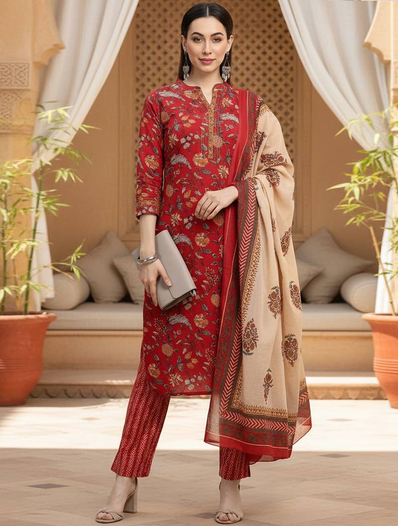 Red Color Printed Pure Cotton Styles Kurta Trouser With Dupatta