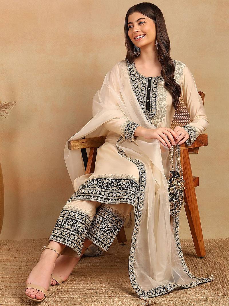 Women Cream Silk Blend Solid Embroidered Straight Kurta Trouser With Dupatta