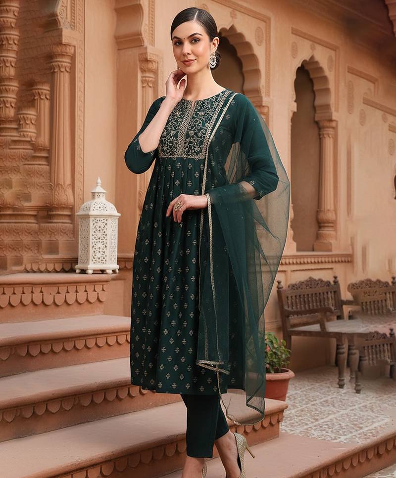 Women Green Silk Blend Solid Woven Design Flared Empire Kurta Pant With Dupatta