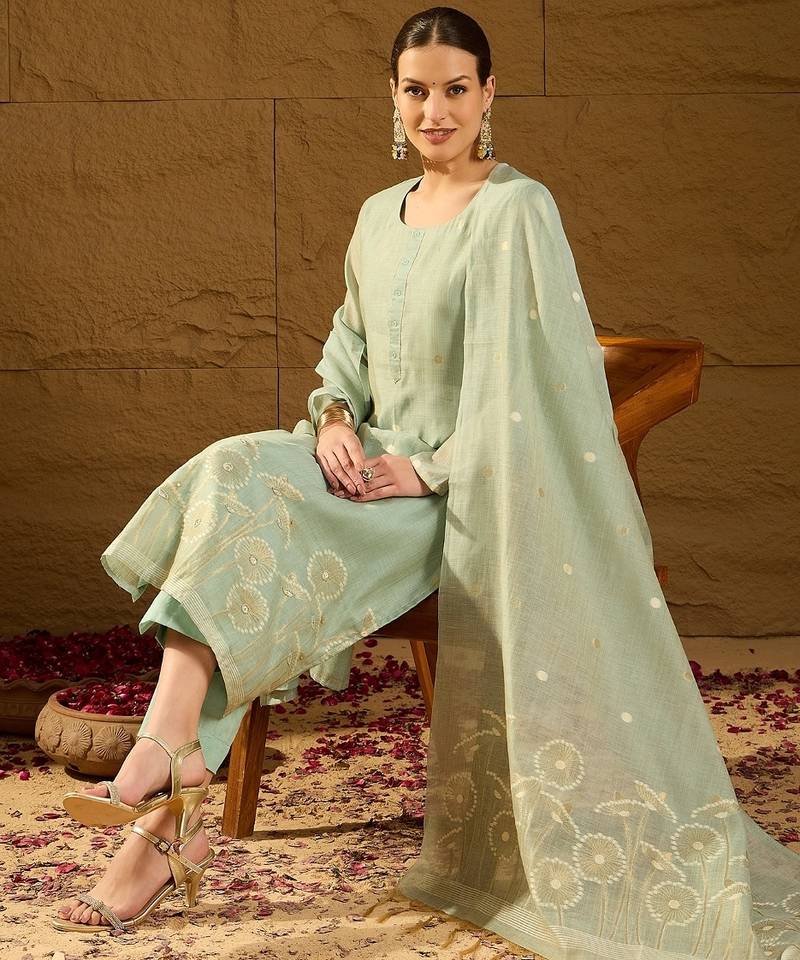 Women Blue Chanderi Solid Woven Design Straight Kurta Trousers With Dupatta