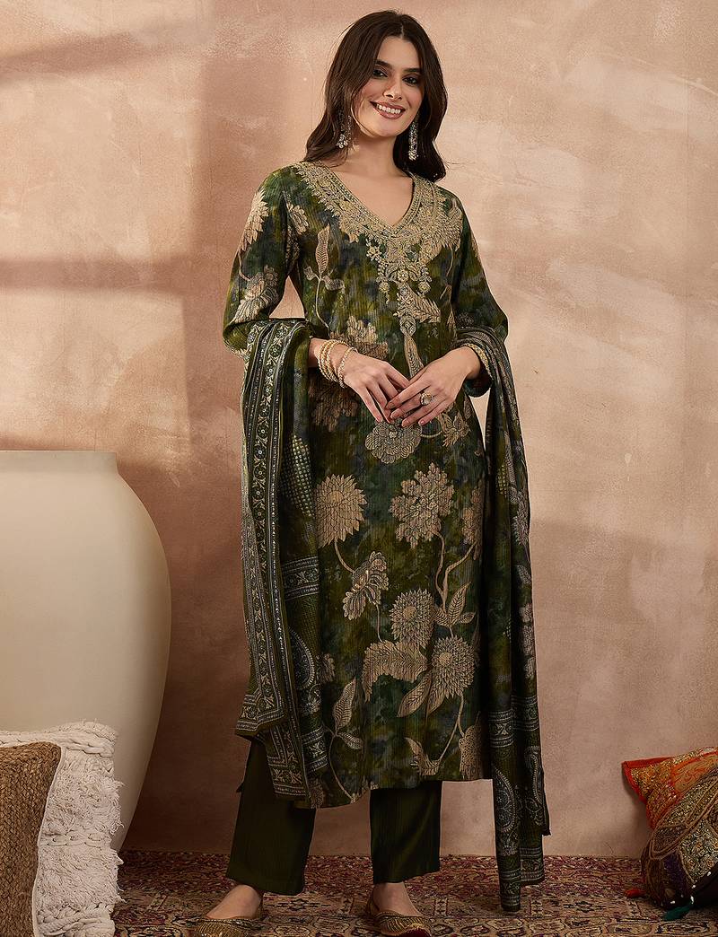 Women Green Polyester Floral Printed Straight Kurta Trousers With Dupatta