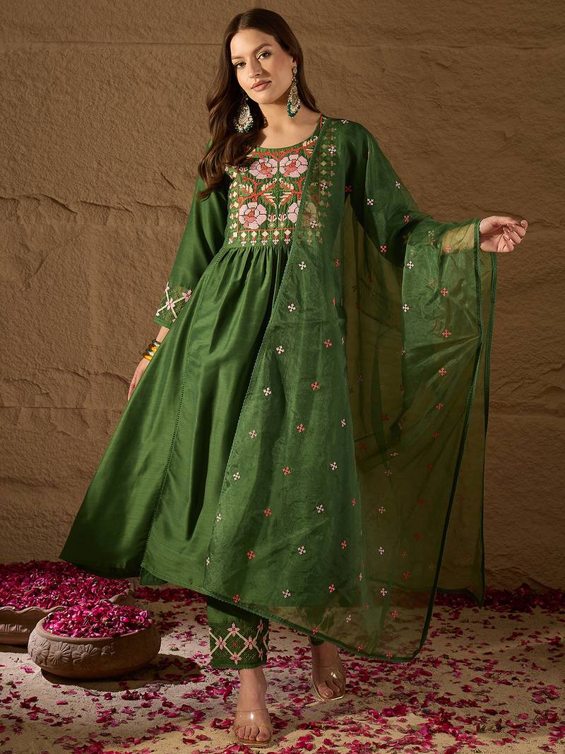 • Product Id : 4584175 • Package Details : 1 Kurta / 1 Bottom / 1 Dupatta • Type : Kurta Sets • Region : India • Work : Embroidered • Type : Floral Print • Look : Traditional • Sleeve : Quarter Sleeve • Neck Style : Round Neck • Color : Green • Fabric : Silk Blend • Stitching : Stitched • Length : 46.0 Payments [+]
