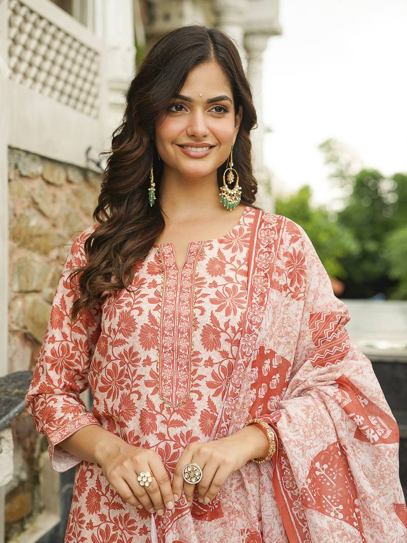 Women Orange Rayon Blend Floral Printed Straight Kurta Trousers With Dupatta