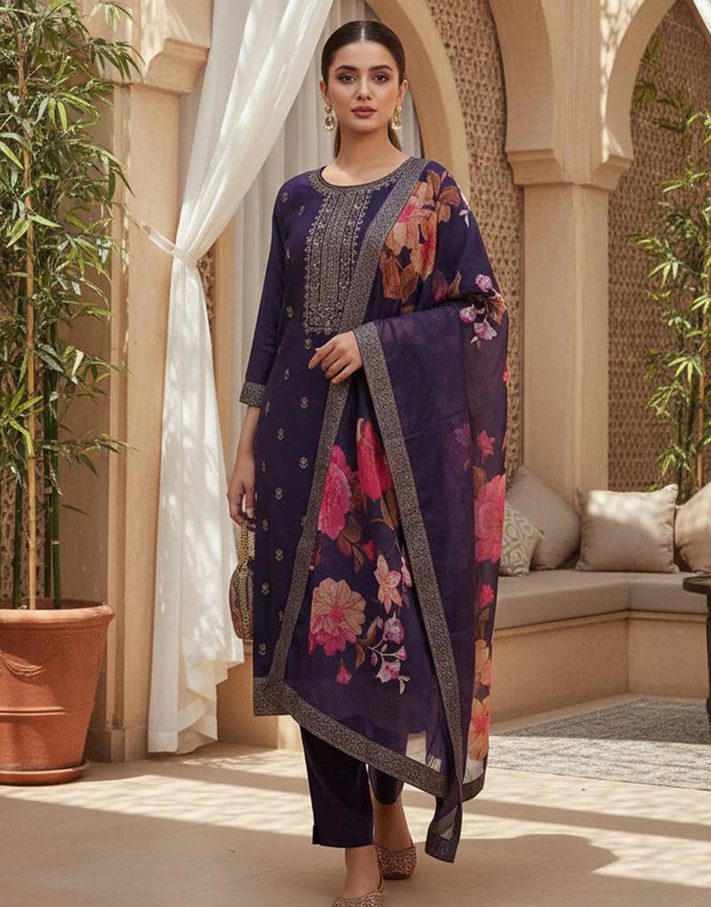 Women Purple Silk Blend Ethnic Motifs Stoning Straight Kurta Trouser With Dupatta