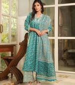 Introducing The 'Ahika' Women'S Kurta, Trousers With Dupatta Suit Set, Where Comfort Meets Elegance! This Stunning Set Combines Vibrant Turquoise Blue Color, Intricate Printed Floral Pattern, And High-Quality Rayon Blend Fabric, Featuring Three-Quarter Sleeves And A Shawl Collar For A Sophisticated Look. Perfect For Weddings, Festivals, Or Casual Evening Wear, This Exquisite Suit Set Elevates Your Style Quotient With Its Unique Blend Of Traditional And Modern Elements, Making It A Standout Piece In Your Wardrobe.