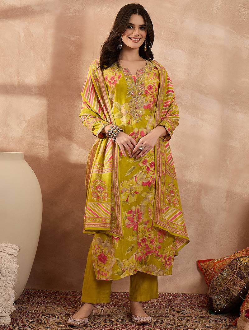 Women Yellow Polyester Floral Printed Straight Kurta Trousers With Dupatta