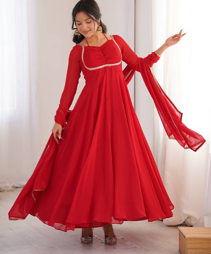 Elegant Red Georgette Anarkali Gown With Dupatta Stitched