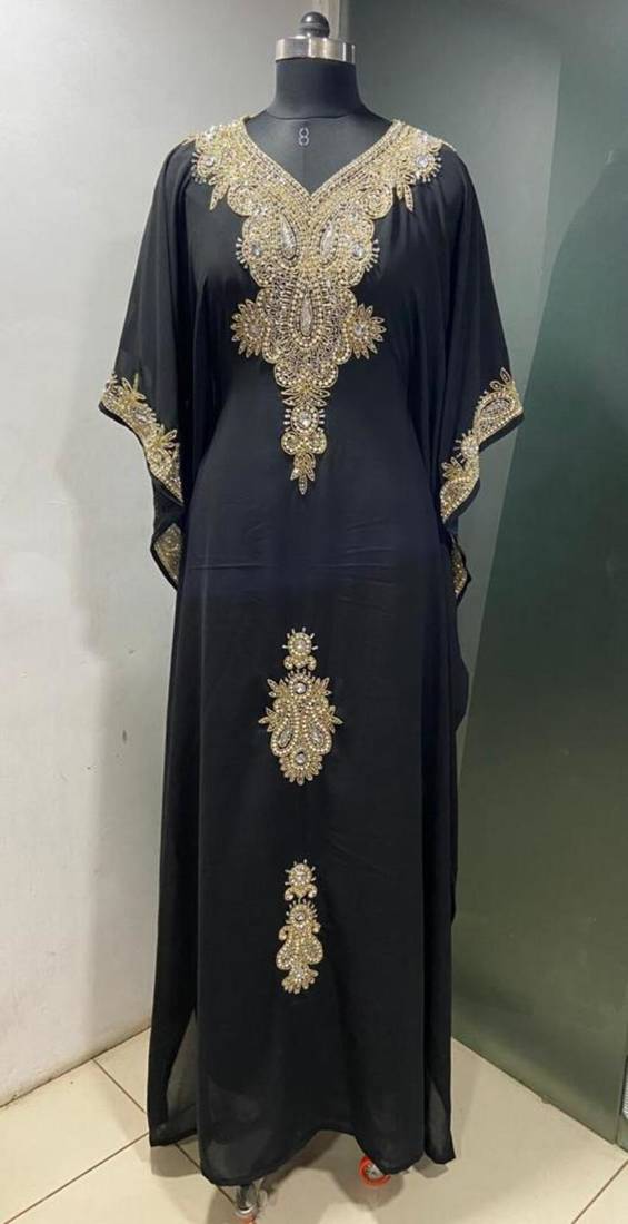 This fancy kaftans is best for special occasions and birthday parties. It is made with finest georgette material and good care has been taking while in beading and stitching work. This beautiful kaftan comes with the attached lining in different sizes like XS, S, M, L, XL, XXL, 3XL, 4XL and Free size