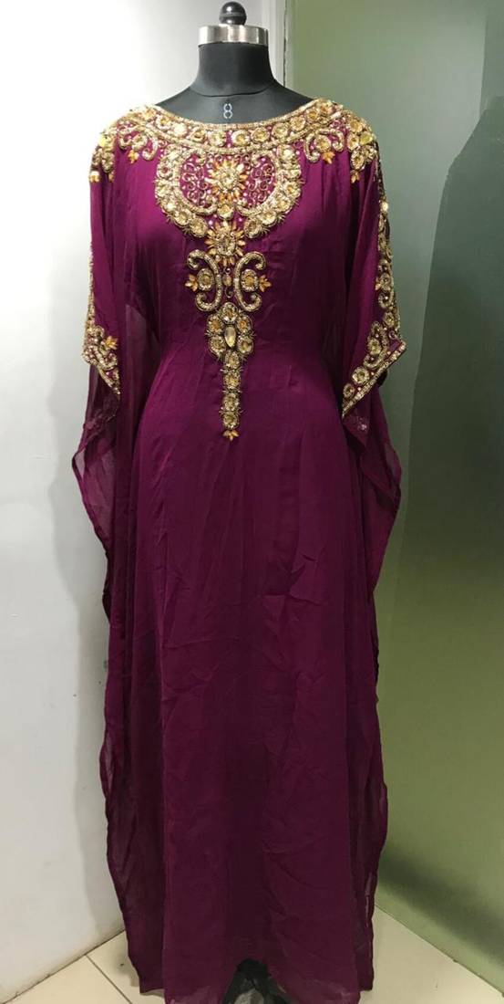This fancy kaftans is best for special occasions and birthday parties. It is made with finest georgette material and good care has been taking while in beading and stitching work. This beautiful kaftan comes with the attached lining in different sizes like XS, S, M, L, XL, XXL, 3XL, 4XL and Free size