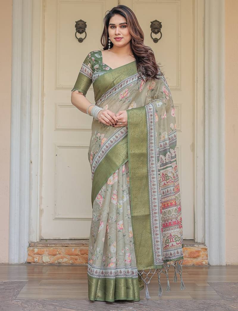 If you find the product for less we'll match it! Know MoreEmbrace effortless elegance with this handloom Linen Weaved With Golden Zari floral printed saree, crafted to bring together heritage artistry and modern comfort. Made from premium handloom Linen Weaved With Golden Zari, this saree showcases delicate floral digital prints that bloom across the fabric with a soft, artistic touch. Edged with playful tassels on the pallu, it adds a charming flair that complements both casual and festive occasions.