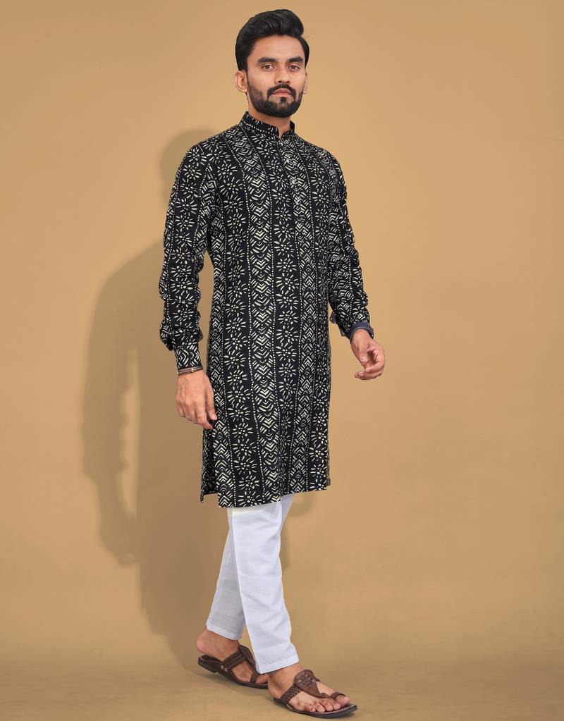 • Product Id : 4680536 • Package Details : 1 Kurta • Type : Kurta • Fabric : Cotton • Work : Printed • Look : Designer • Sleeve : Full Sleeve • Neck Style : Chinese Collar Kameez • Color : Black • Top Color : Black • Top Fabric : Cotton • Stitching : Stitched Payments [+]