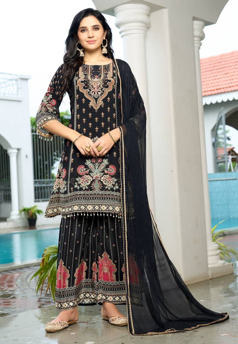 • Product Id : 4674983 • Package Details : 1 Top : 1 Bottom : 1 Dupatta • Type : Readymade Suits For Women • Occasion : Ceremonial • Work : Printed • Type : Hand Embroidery • Look : Designer • Sleeve : Quarter Sleeve • Color : Black • Fabric : Pure Crepe • Stitching : Stitched Payments [+]