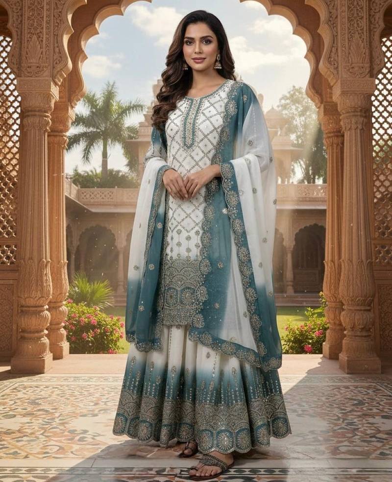 • Fabric : Georgette • Color : White,Blue • Style : Palazzo • Color : White Dupatta Details