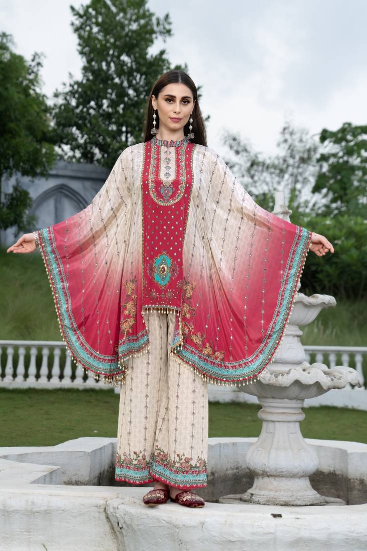 Cream & Red Printed With Handwork Natural Crepe Kaftan With Plazzo
