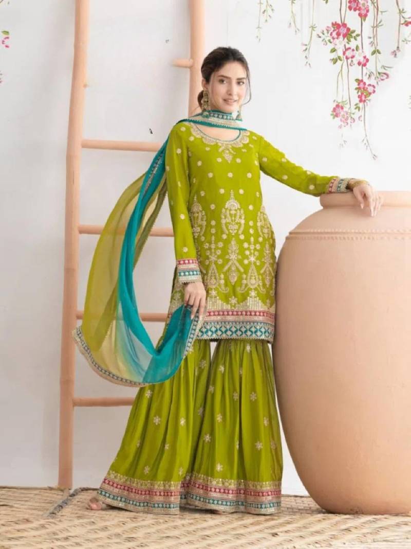 $139.47$410.2(66% OFF)price changedSelect SizexGreen Chinon Semi Stitched Sharara Suit With Embroidered Sequence & Mirror Work$139.47$410.266% OFFSize$139.47$410.2(66% OFF)Size$139.47$410.2(66% OFF)Product ID : 4682978Estimated Delivery: 09 Feb 2026NEED HELP ?Price Match Promise