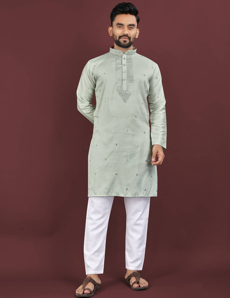 • Product Id : 4681366 • Package Details : 1 Kurta • Type : Kurta • Occasion : Wedding • Fabric : Silk • Work : Embroidered • Type : Sequins Work • Look : Fashion • Sleeve : Full Sleeve • Neck Style : Collar Neck Kameez • Color : Green • Top Color : Green • Top Fabric : Silk • Stitching : Stitched Payments [+]