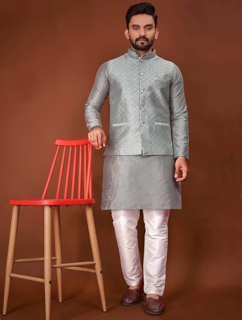 • Product Id : 4694759 • Package Details : 1 Kurta : 1 Koti : 1 Payjama • Type : Nehru Jacket • Fabric : Silk • Work : Woven • Type : Zari Work • Look : Designer • Sleeve : Full Sleeve • Neck Style : Chinese Collar Kameez • Color : Grey • Bottom Fabric : Cotton • Bottom Color : White • Top Color : Grey • Top Fabric : Silk • Bottom Style : Pyjama • Stitching : Stitched Payments [+]
