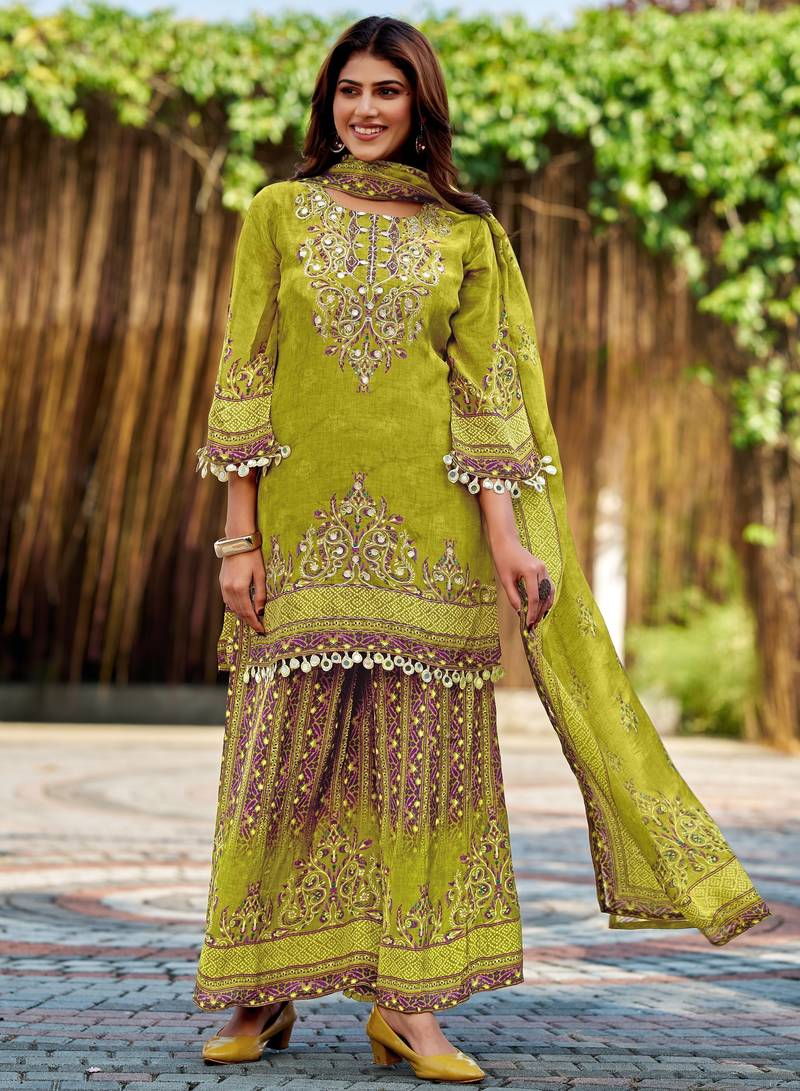 • Product Id : 4674980 • Package Details : 1 Top : 1 Bottom : 1 Dupatta • Type : Readymade Suits For Women • Occasion : Ceremonial • Work : Printed • Type : Hand Embroidery • Look : Designer • Sleeve : Quarter Sleeve • Color : Light Green • Fabric : Pure Crepe • Stitching : Stitched Payments [+]