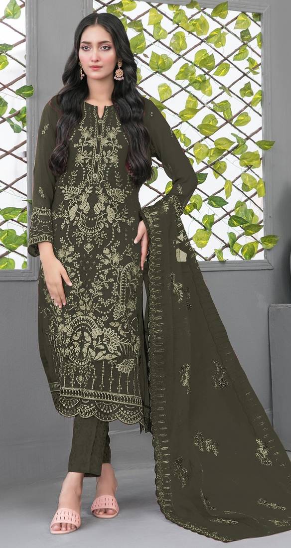 • Kameez : Color- Mehendi • Dupatta : Color- Mehendi / Fabric- Faux Georgette • Bottom : Color- Mehendi / Fabric- Santoon Kameez Details