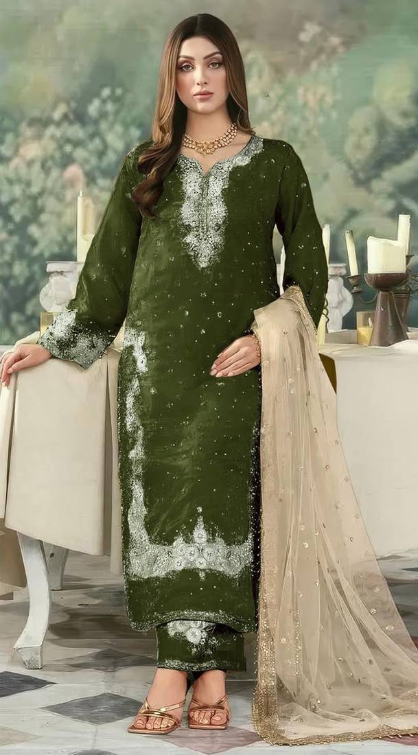 • Kameez : Color- Mehendi • Dupatta : Color- Cream / Fabric- Net • Bottom : Color- Mehendi / Fabric- Santoon Kameez Details